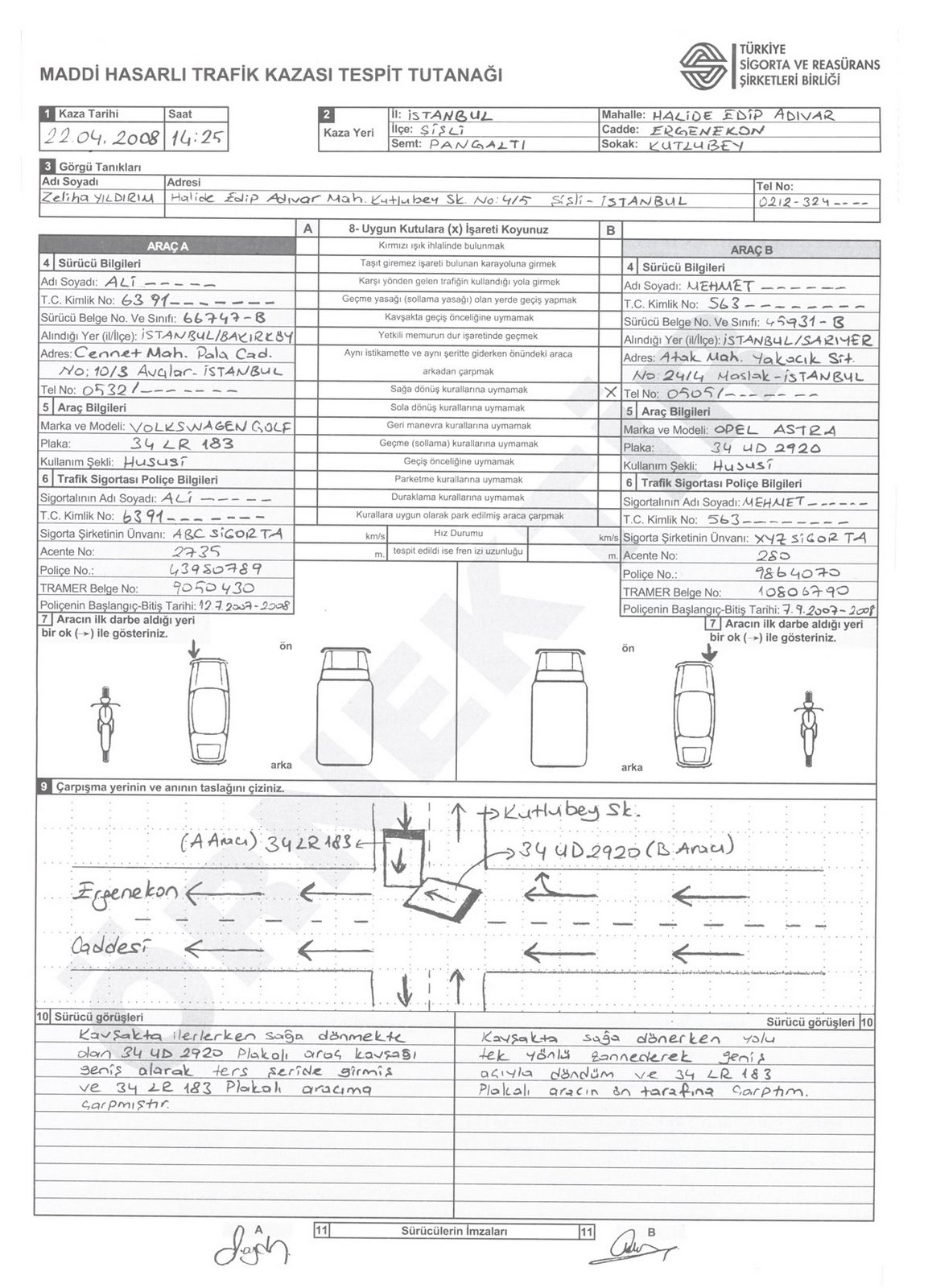 Araç ve trafik sigortasına ait bilgiler her iki araç için ayrı ayrı ve eksiksiz olarak doldurulduktan sonra imzalanmalıdır. İmzalanmayan kaza tespit tutanakları kabul edilmemektedir. Kaza tespit tutanağı iki nüsha olarak hazırlanmalıdır.